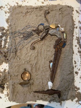 rusty junk, stones, shells, ceramics, pocket watch, fossil
