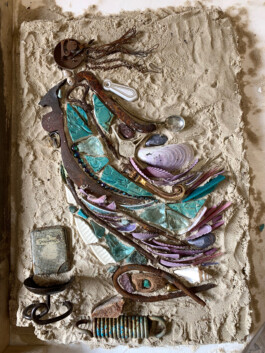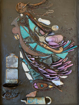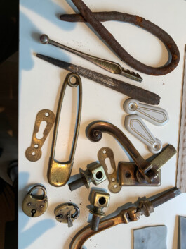 rusty junk, shells, ceramics, my grandma's pearl necklace, stollwerck cigarette case, bicycle bell, candle holder,
